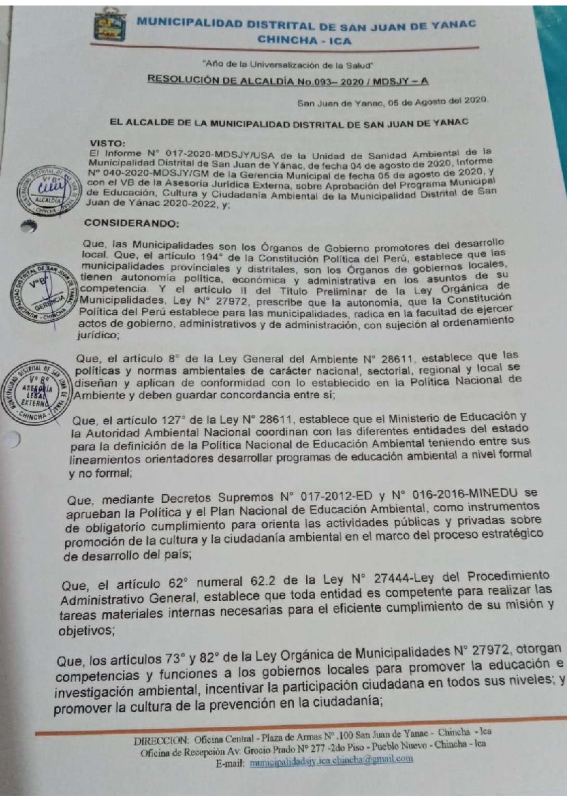 La presente Resolución aprueba el Programa Municipal de Educación, Cultura y Ciudadanía Ambiental de la Municipalidad Distrital de San Juan de Yanac, para el periodo 2020- 2022; con la finalidad de promover la cultura y la educación ambiental para la formación de ciudadanas y ciudadanos ambientalmente responsables e incentivar la participación ciudadana en todos sus niveles.