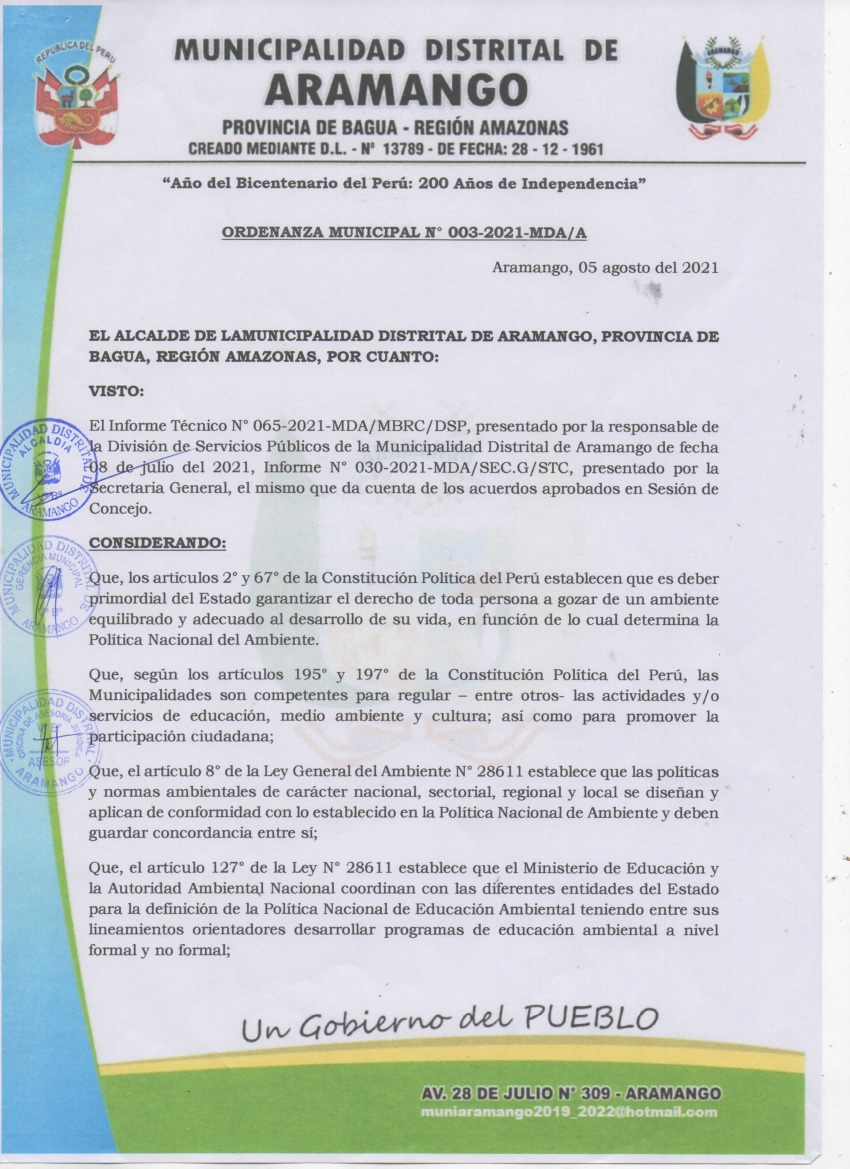 Programa Municipal de Educación, Cultura y Ciudadanía Ambiental de la Municipalidad Distrital de Aramango 2021 - 2022