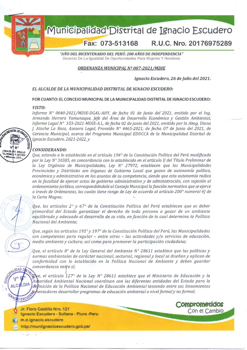 La presente Ordenanza aprueba el Programa Municipal de Educación, Cultura y Ciudadanía Ambiental de la Municipalidad Distrital de Ignacio Escudero, para el periodo 2021 - 2022; con la finalidad de promover la cultura y la educación ambiental para la formación de ciudadanas y ciudadanos ambientalmente responsables e incentivar la participación ciudadana en todos sus niveles.