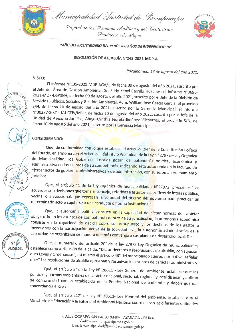 La presente Resolución aprueba el Programa Municipal de Educación, Cultura y Ciudadanía Ambiental de la Municipalidad Distrital de Pacaipampa, para el periodo 2021 - 2022; con la finalidad de promover la cultura y la educación ambiental para la formación de ciudadanas y ciudadanos ambientalmente responsables e incentivar la participación ciudadana en todos sus niveles.