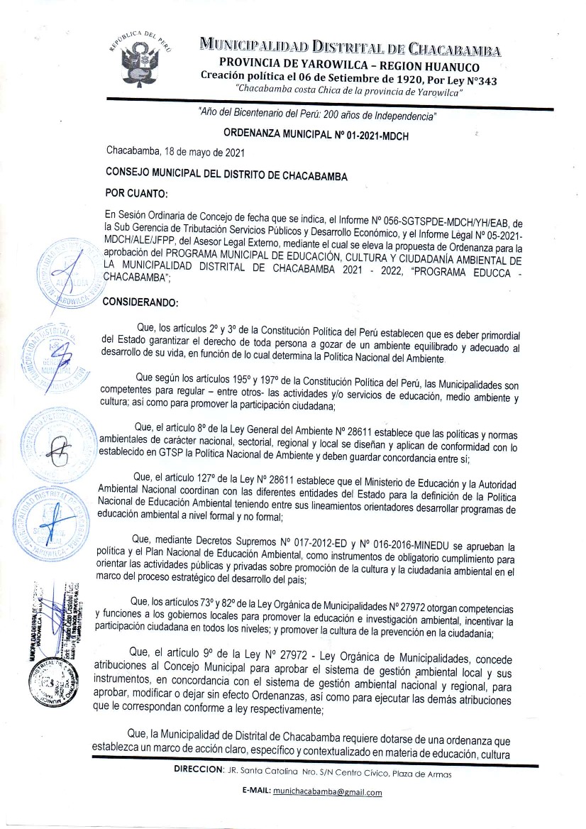 La presente Ordenanza aprueba el Programa Municipal de Educación, Cultura y Ciudadanía Ambiental de la Municipalidad Distrital de Chacabamba, para el periodo 2021 - 2022; con la finalidad de promover la cultura y la educación ambiental para la formación de ciudadanas y ciudadanos ambientalmente responsables e incentivar la participación ciudadana en todos sus niveles.