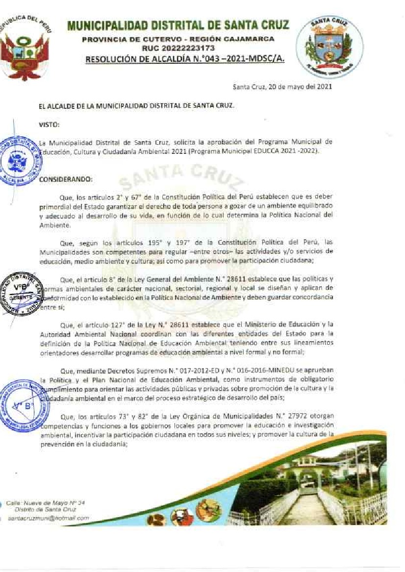 Resolución de Alcaldía N° 043-2021-MDSC-A - Programa Municipal de Educación, Cultura y Ciudadanía Ambiental de la Municipalidad Distrital de Santa Cruz 2021 – 2022