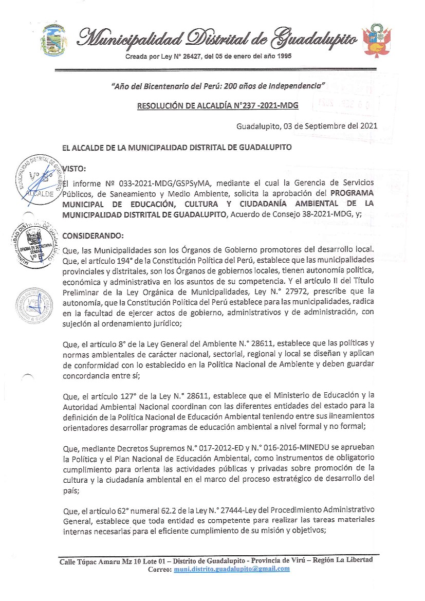 La presente Resolución aprueba el Programa Municipal de Educación, Cultura y Ciudadanía Ambiental de la Municipalidad Distrital de Guadalupito, para el periodo 2021- 2022; con la finalidad de promover la cultura y la educación ambiental para la formación de ciudadanas y ciudadanos ambientalmente responsables e incentivar la participación ciudadana en todos sus niveles.