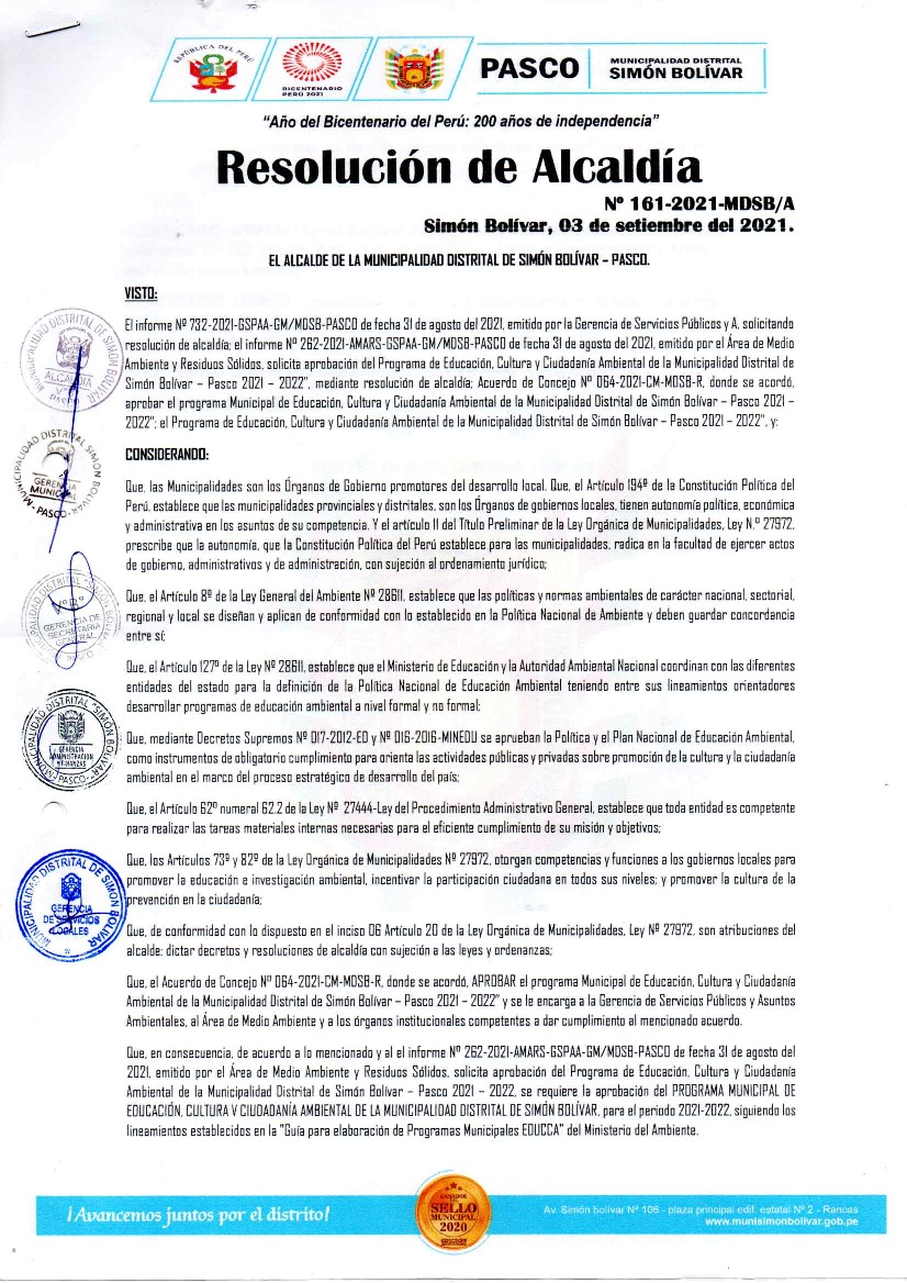 La presente Resolución aprueba el Programa Municipal de Educación, Cultura y Ciudadanía Ambiental de la Municipalidad Distrital de Simón Bolívar, para el periodo 2021- 2022; con la finalidad de promover la cultura y la educación ambiental para la formación de ciudadanas y ciudadanos ambientalmente responsables e incentivar la participación ciudadana en todos sus niveles.