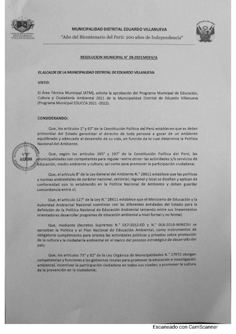 Resolución de Alcaldía N° 028-2021-MDEV-A - Programa Municipal de Educación, Cultura y Ciudadanía Ambiental de la Municipalidad Distrital de Eduardo Villanueva 2021 – 2022