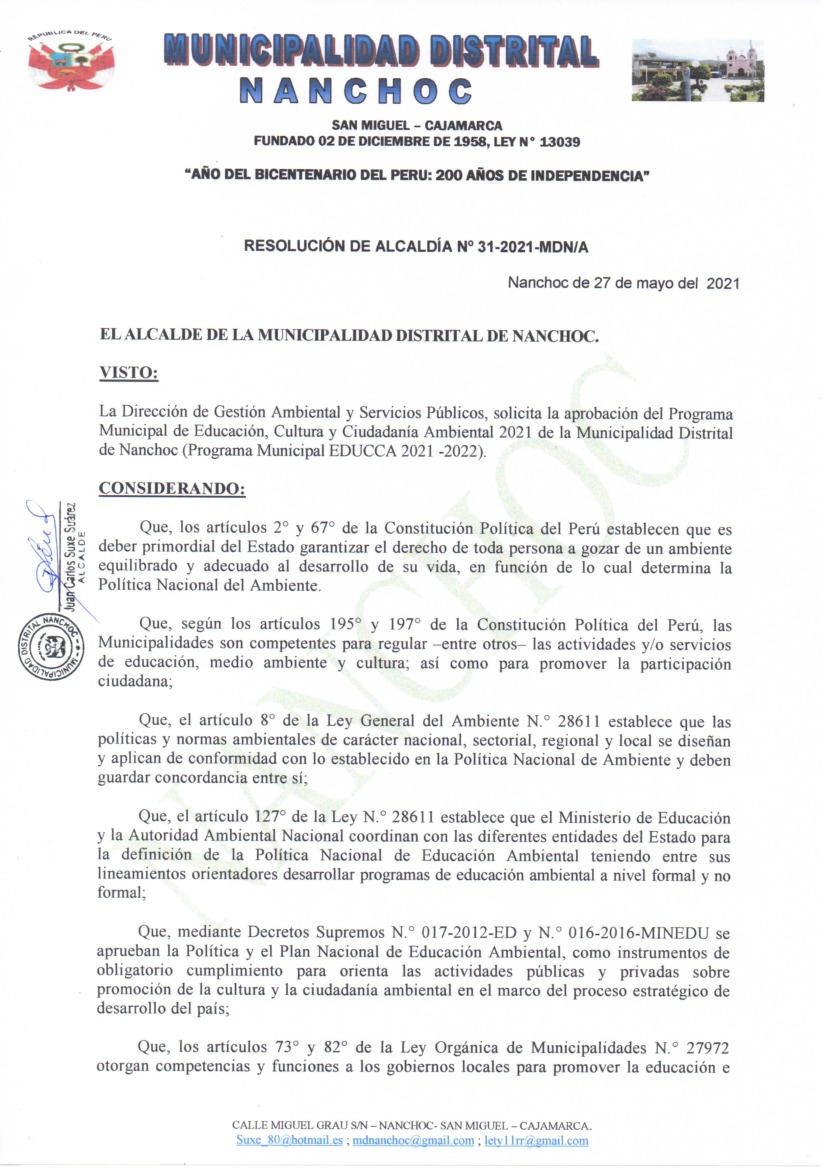 Programa Municipal de Educación, Cultura y Ciudadanía Ambiental de la Municipalidad Distrital de Nanchoc 2021 – 2022 - Resolución de Alcaldía N° 31-2021-MDN-A - Municipalidad Distrital de Nanchoc 2021 – 2022
