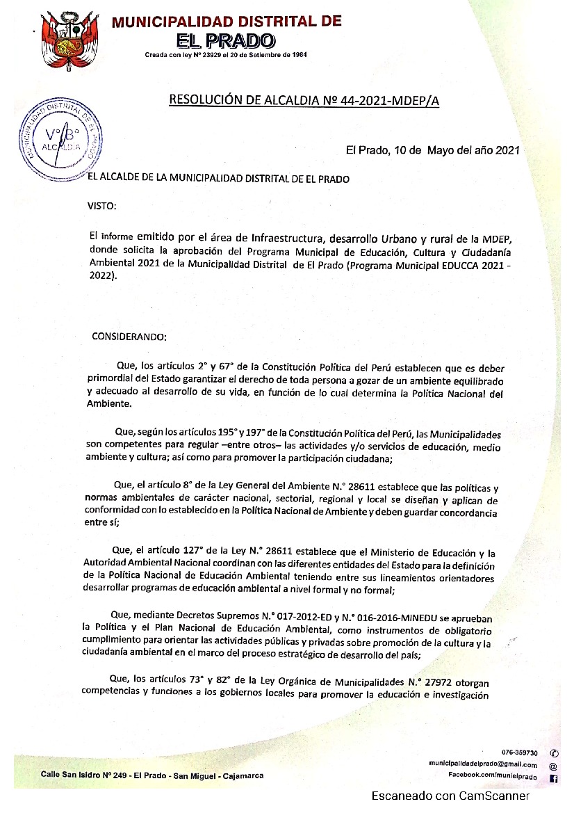 Programa Municipal de Educación, Cultura y Ciudadanía Ambiental de la Municipalidad Distrital de El Prado 2021 – 2022 - Resolución de Alcaldía N° 044-2021-MDEP-A - Municipalidad Distrital de El Prado 2021 – 2022