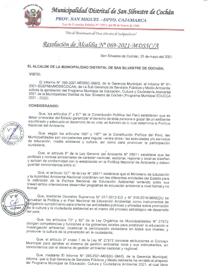 Resolución de Alcaldía N° 069-2021-MDSSC-A - Municipalidad Distrital de San Silvestre de Cochan 2021 – 2022 - Programa Municipal de Educación, Cultura y Ciudadanía Ambiental de la Municipalidad Distrital de San Silvestre de Cochan 2021 – 2022