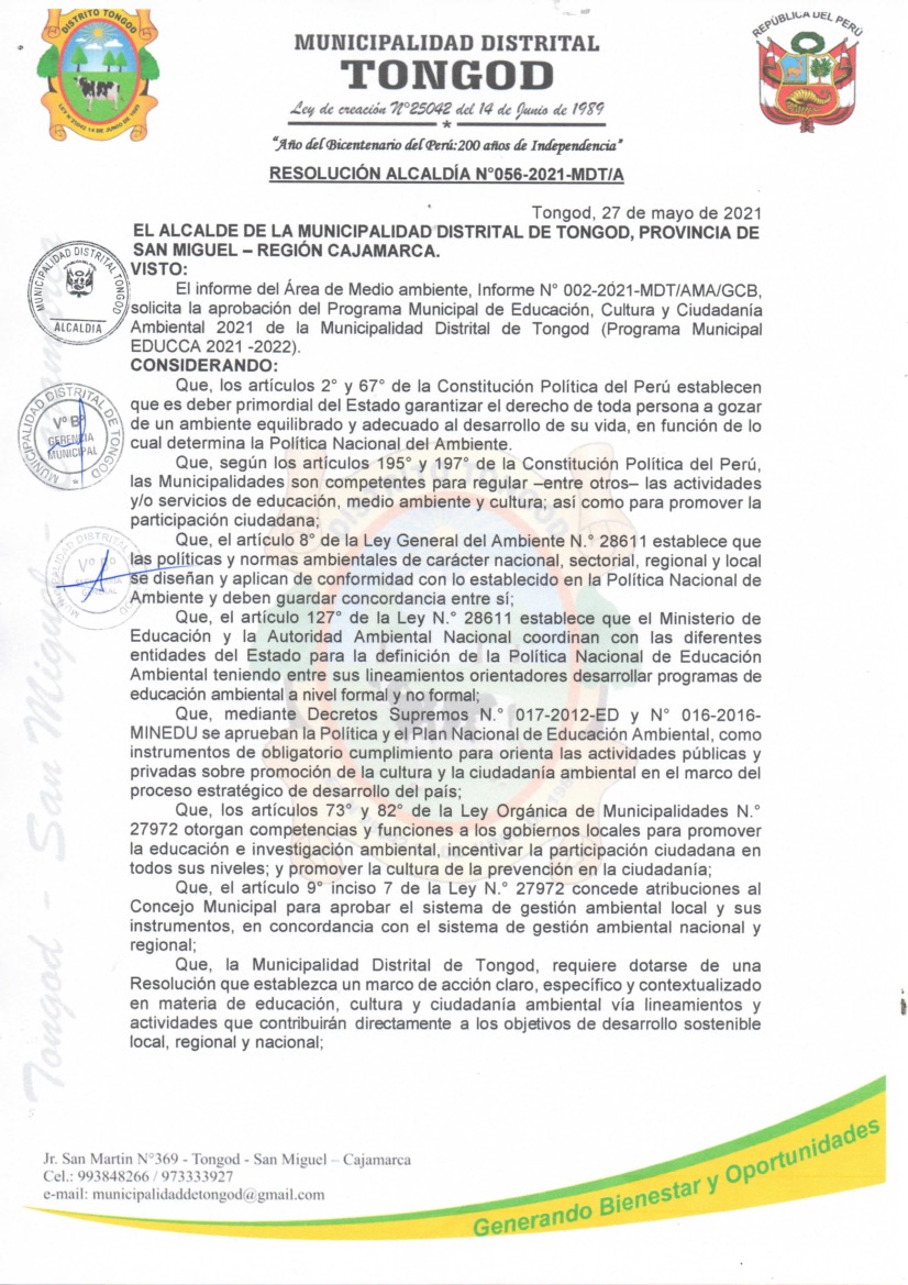 Resolución de Alcaldía N° 056-2021-MDT-A - Municipalidad Distrital de Tongod 2021 – 2022 - Programa Municipal de Educación, Cultura y Ciudadanía Ambiental de la Municipalidad Distrital de Tongod 2021 – 2022