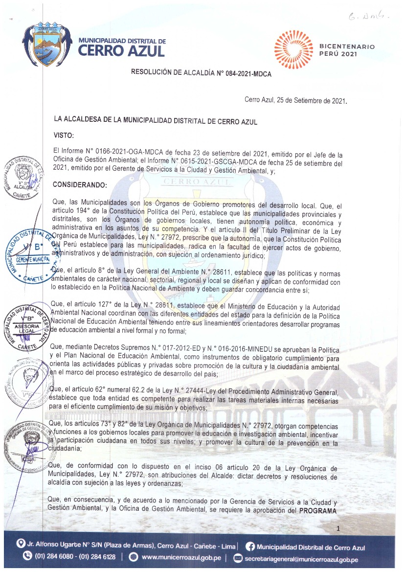 Programa Municipal de Educación, Cultura y Ciudadanía Ambiental de la Municipalidad Distrital de Cerro Azul 2021- 2022
