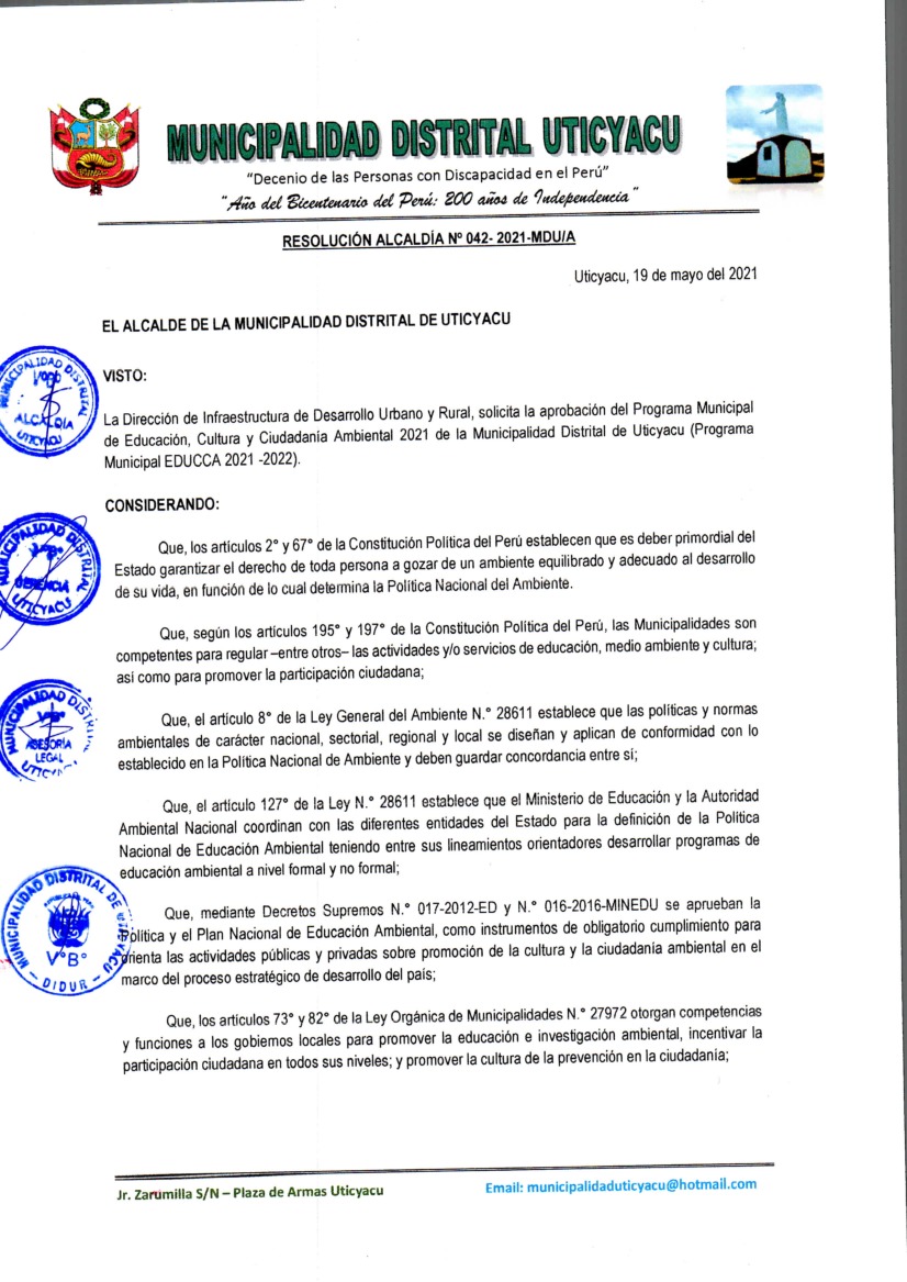 Resolución de Alcaldía N° 042-2021-MDU-A - Municipalidad Distrital de Uticyacu 2021 – 2022