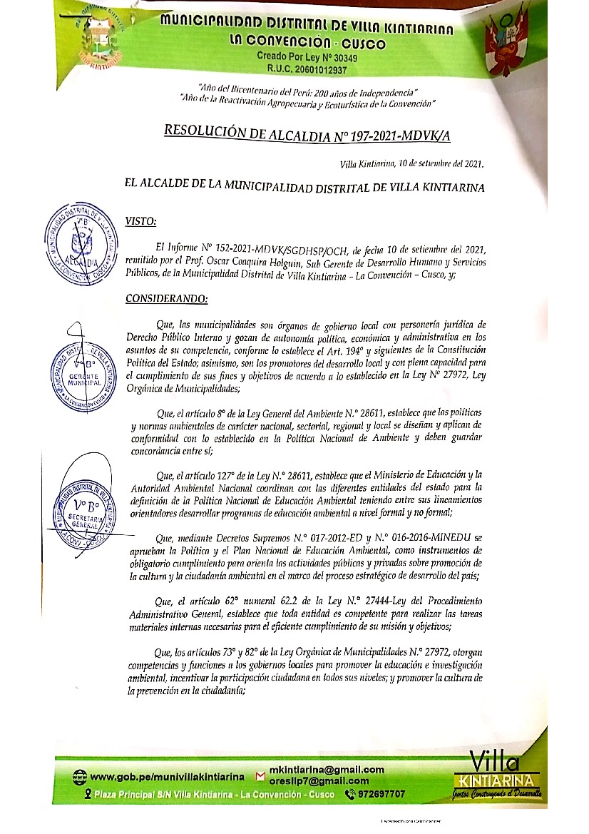 La presente Resolución de Alcaldía aprueba el Programa Municipal de Educación Cultura y Ciudadanía Ambiental de la Municipalidad Distrital de Villa Kintiarina, para el período 2021-2022; con la finalidad de promover la cultura y la educación ambiental para la formación de ciudadanas y ciudadanos ambientalmente responsables e incetivar la participación ciudadana en todos los niveles.