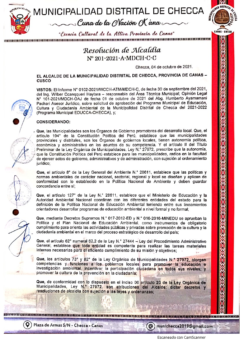 La presente Resolución aprueba el Programa Municipal de Educación, Cultura y Ciudadanía Ambiental de la Municipalidad distrital de Checca para el periodo 2021-2022; con la finalidad de promover la cultura y la educación ambiental para la formación de ciudadanos y ciudadanas ambientalmente responsables e incentivar la participación ciudadana en todos sus niveles.