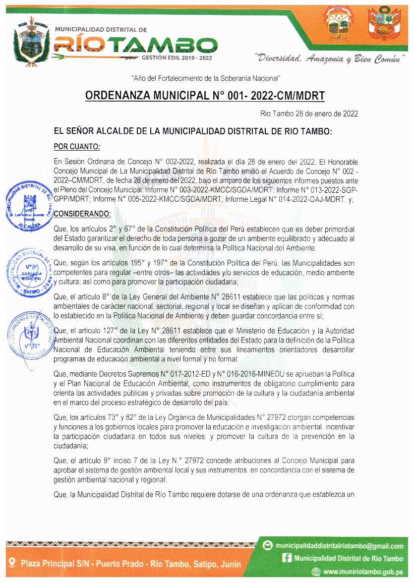 La presente Ordenanza aprueba el Programa Municipal de Educación, Cultura y Ciudadanía Ambiental de la Municipalidad Distrital de Río Tambo, para el año 2022; con la finalidad de promover la cultura y la educación ambiental para la formación de ciudadanas y ciudadanos ambientalmente responsables e incentivar la participación ciudadana en todos sus niveles.
