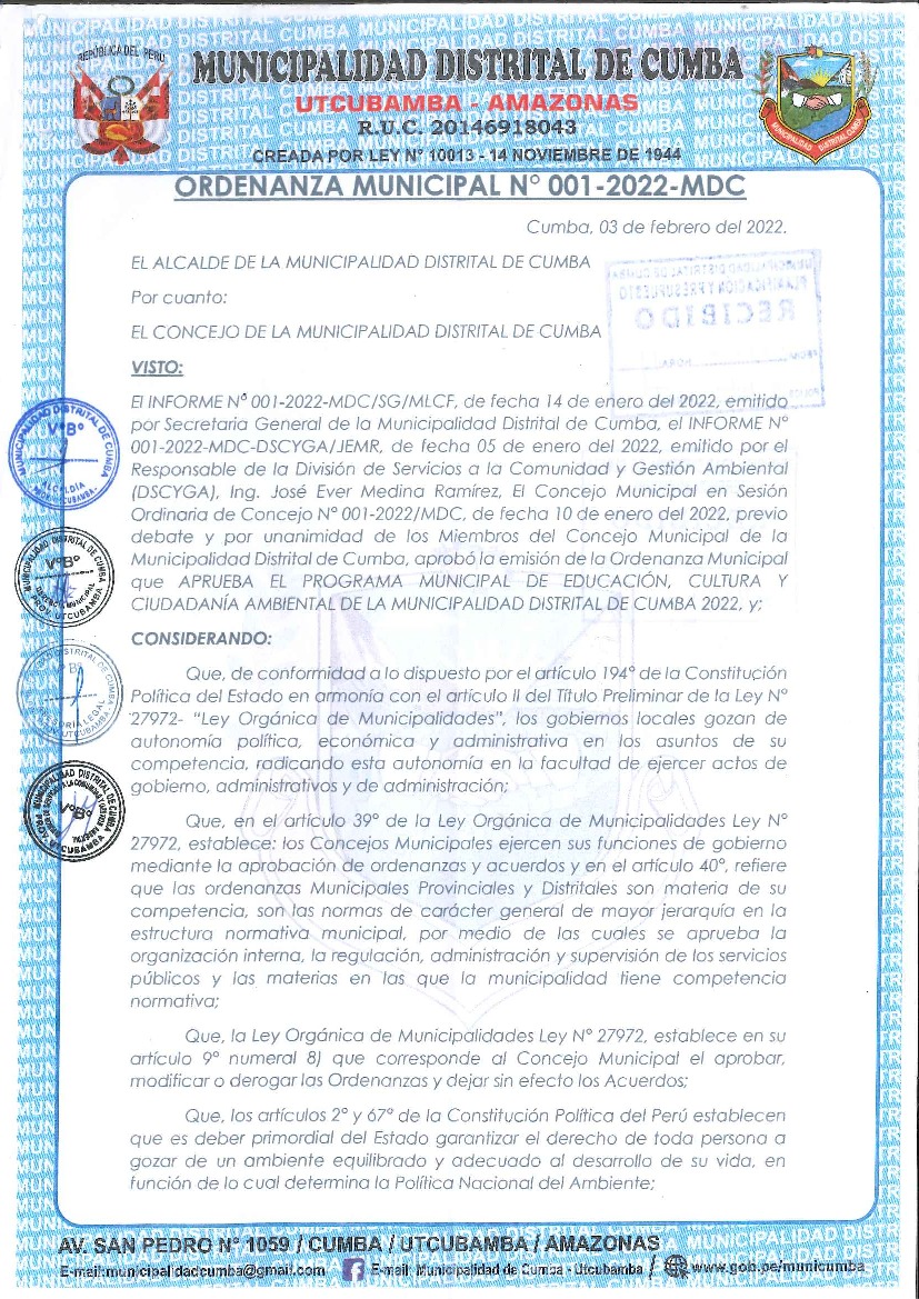 La presente Ordenanza aprueba el Programa Municipal de Educación, Cultura y Ciudadanía Ambiental de la Municipalidad Distrital de Cumba-Utcubamba (Amazonas), para el periodo 2022; con la finalidad de promover la cultura y la educación ambiental para la formación de ciudadanas y ciudadanos ambientalmente responsables e incentivar la participación ciudadana en todos sus niveles