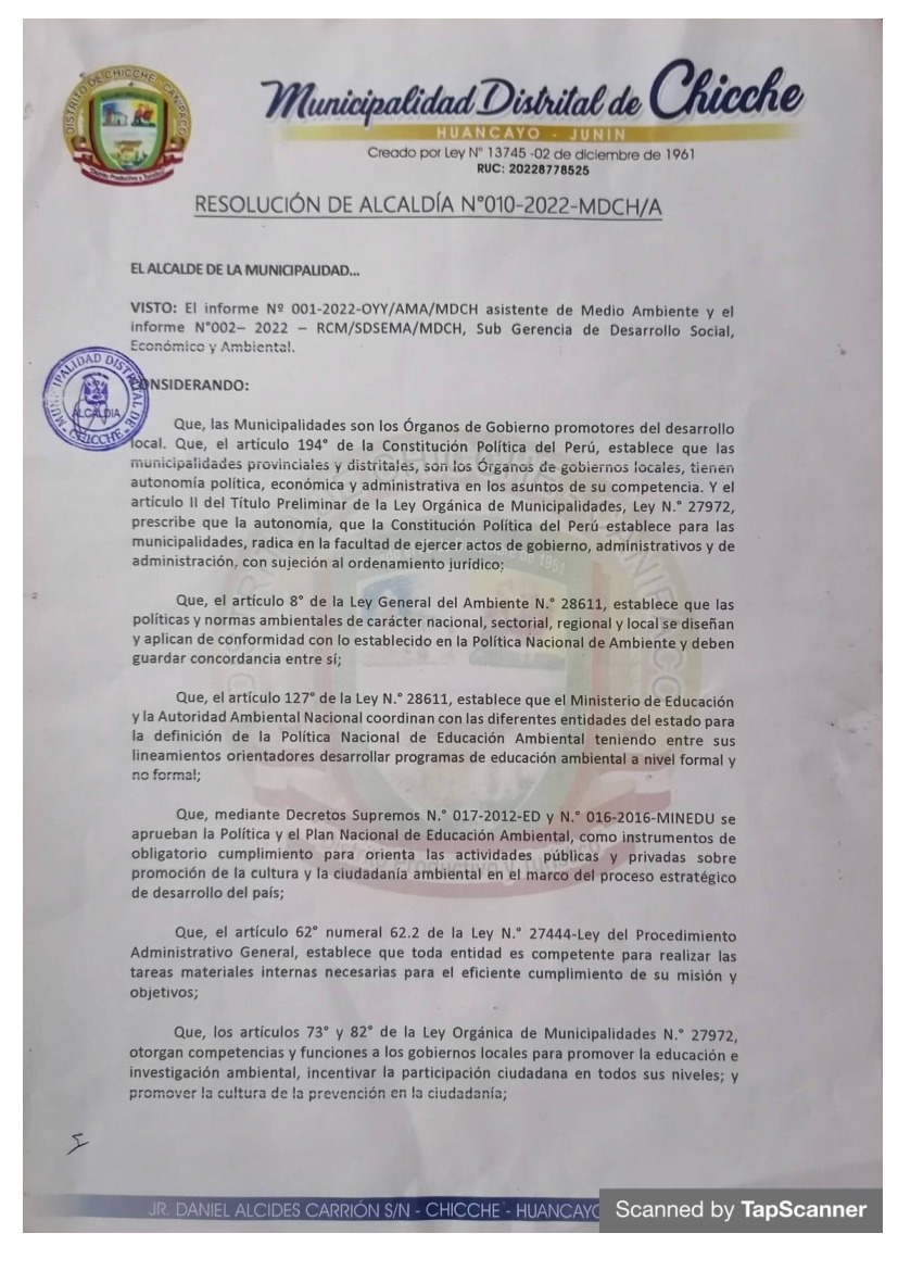 La presente Resolución aprueba el Programa Municipal de Educación, Cultura y Ciudadanía Ambiental de la Municipalidad Distrital de Chicche, para el año 2022; con la finalidad de promover la cultura y la educación ambiental para la formación de ciudadanas y ciudadanos ambientalmente responsables e incentivar la participación ciudadana en todos sus niveles.