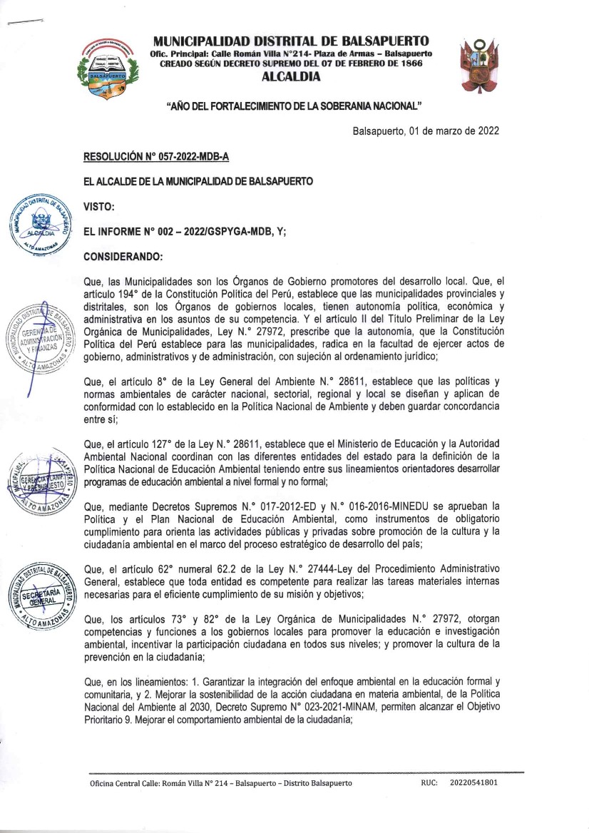 La presente Resolución aprueba el Programa Municipal de Educación, Cultura y Ciudadanía Ambiental de la Municipalidad Distrital de Balsapuerto, para el periodo 2022; con la finalidad de promover la cultura y la educación ambiental para la formación de ciudadanas y ciudadanos ambientalmente responsables e incentivar la participación ciudadana en todos sus niveles.