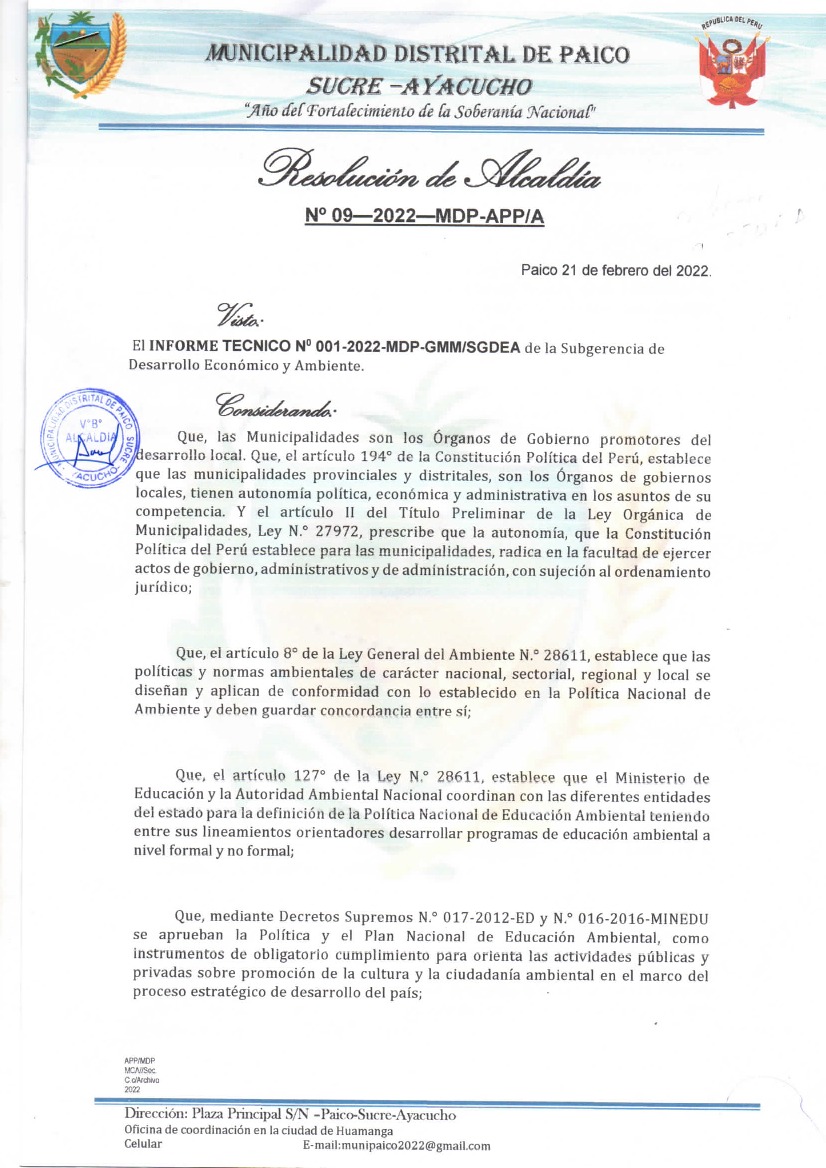 La presente Resolución aprueba el Programa Municipal de Educación, Cultura y Ciudadanía Ambiental de la Municipalidad Distrital de Paico, para el año 2022; con la finalidad de promover la cultura y la educación ambiental para la formación de ciudadanas y ciudadanos ambientalmente responsables e incentivar la participación ciudadana en todos sus niveles.