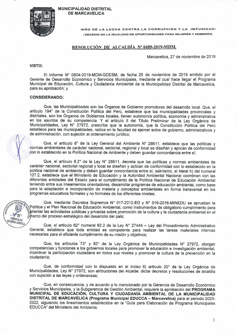 La presente Resolución aprueba el Programa Municipal de Educación, Cultura y Ciudadanía Ambiental de la Municipalidad Distrital de Marcavelica, para el periodo 2019 - 2022; con la finalidad de promover la cultura y la educación ambiental para la formación de ciudadanas y ciudadanos ambientalmente responsables e incentivar la participación ciudadana en todos sus niveles.
