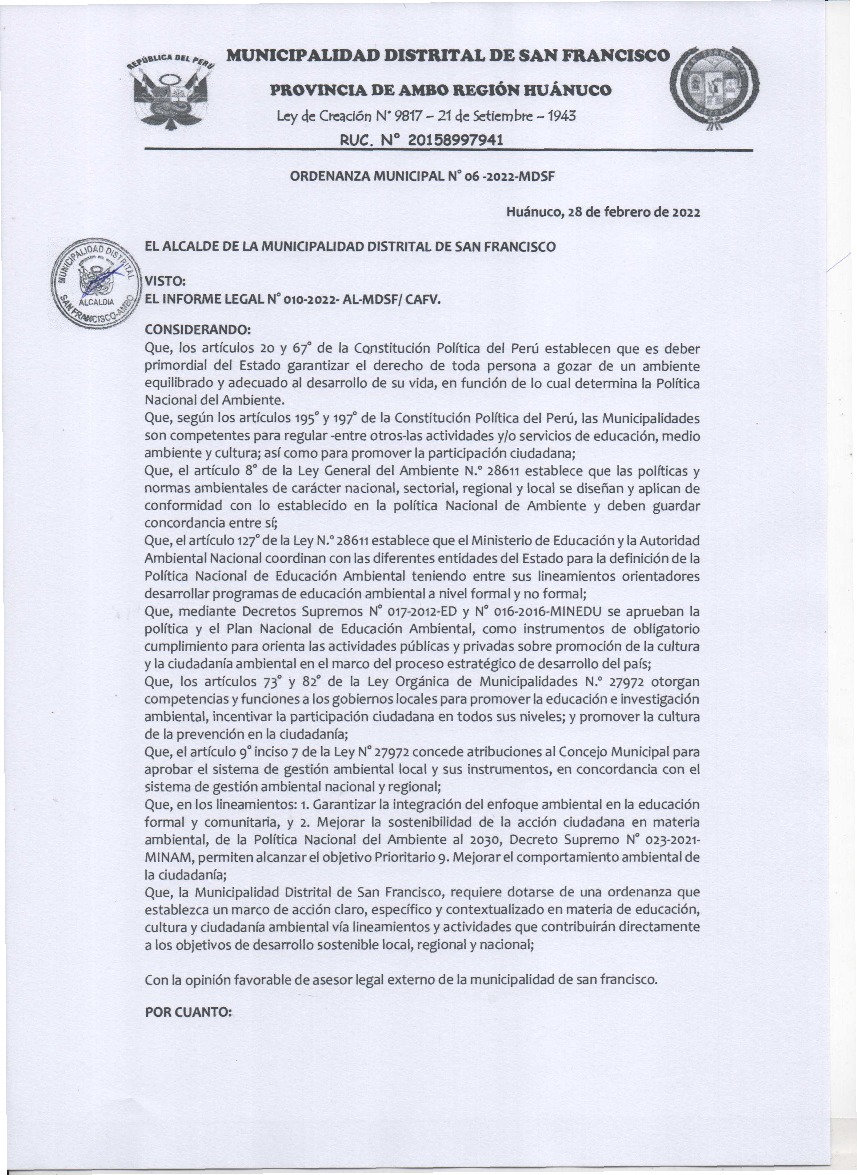 La presente Ordenanza aprueba el Programa Municipal de Educación, Cultura y Ciudadanía Ambiental de la Municipalidad Distrital de San Francisco, para el periodo 2022; con la finalidad de promover la cultura y la educación ambiental para la formación de ciudadanas y ciudadanos ambientalmente responsables e incentivar la participación ciudadana en todos sus niveles.