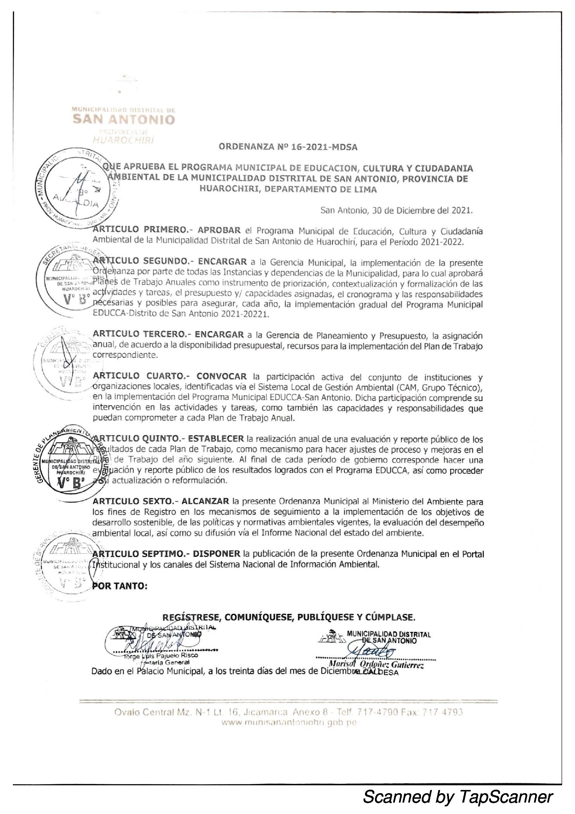 La presente Ordenanza aprueba el Programa Municipal de Educación, Cultura y Ciudadanía Ambiental de la Municipalidad Distrital de San Antonio - Huarochirí, para el periodo 2021-2022; con la finalidad de promover la cultura y la educación ambiental para la formación de ciudadanas y ciudadanos ambientalmente responsables e incentivar la participación ciudadana en todos sus niveles.