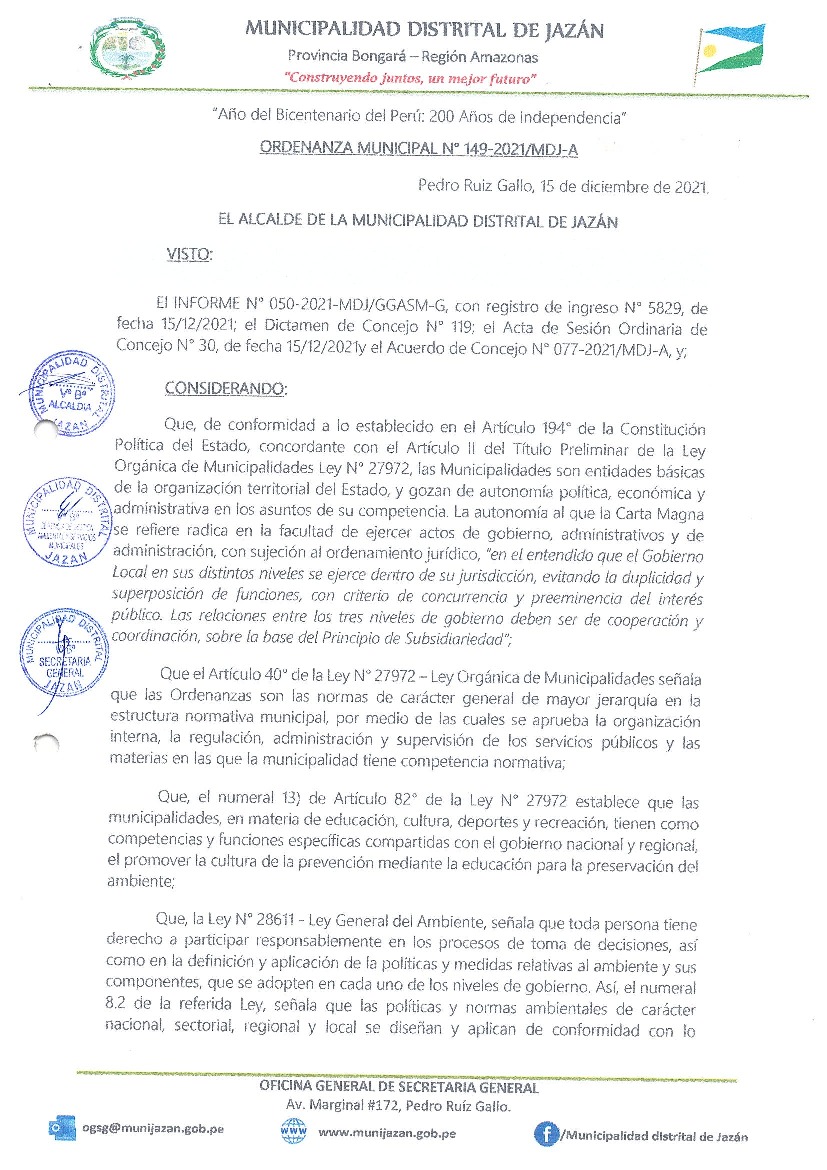 La presente Ordenanza aprueba el Programa Municipal de Educación, Cultura y Ciudadanía Ambiental de la Municipalidad Distrital de Jazán-Bongará (Amazonas), para el periodo 2022; con la finalidad de promover la cultura y la educación ambiental para la formación de ciudadanas y ciudadanos ambientalmente responsables e incentivar la participación ciudadana en todos sus niveles