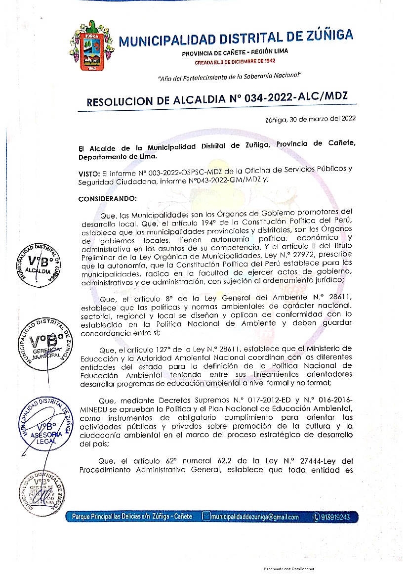 La presente Resolución aprueba el Programa Municipal de Educación, Cultura y Ciudadanía Ambiental de la Municipalidad Distrital de Zuñiga - Cañete - Lima, para el periodo 2021-2022; con la finalidad de promover la cultura y la educación ambiental para la formación de ciudadanas y ciudadanos ambientalmente responsables e incentivar la participación ciudadana en todos sus niveles.