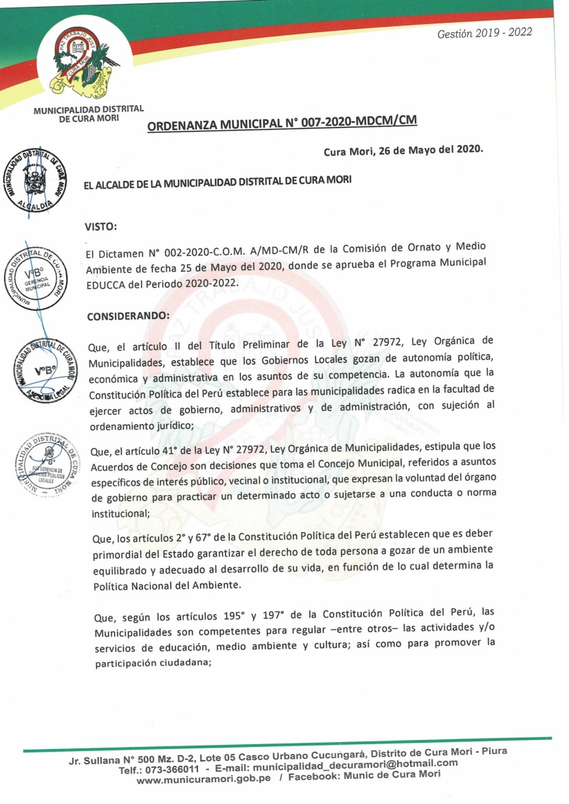 Programa Municipal de Educación, Cultura y Ciudadanía Ambiental de la Municipalidad Distrital de Cura Mori 2020- 2022
