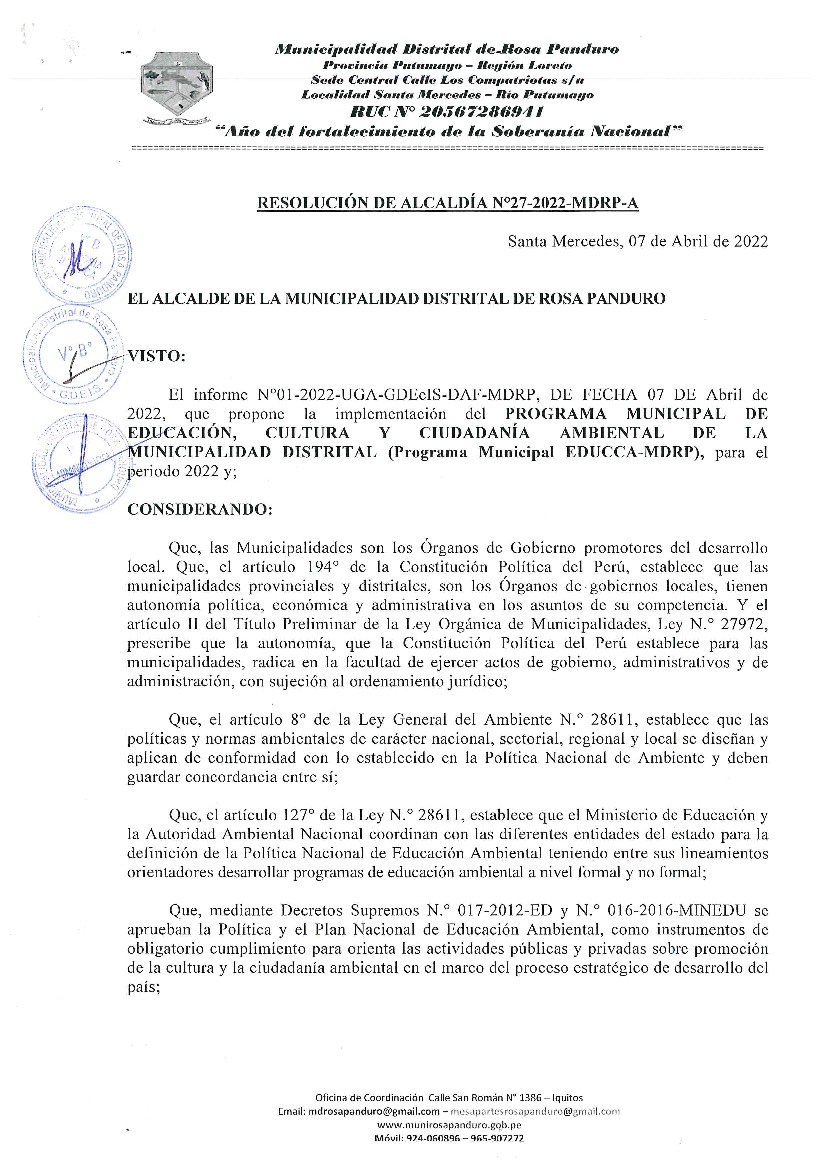 La presente Resolución aprueba el Programa Municipal de Educación, Cultura y Ciudadanía Ambiental de la Municipalidad Distrital de Rosa Panduro, para el periodo 2022; con la finalidad de promover la cultura y la educación ambiental para la formación de ciudadanas y ciudadanos ambientalmente responsables e incentivar la participación ciudadana en todos sus niveles.