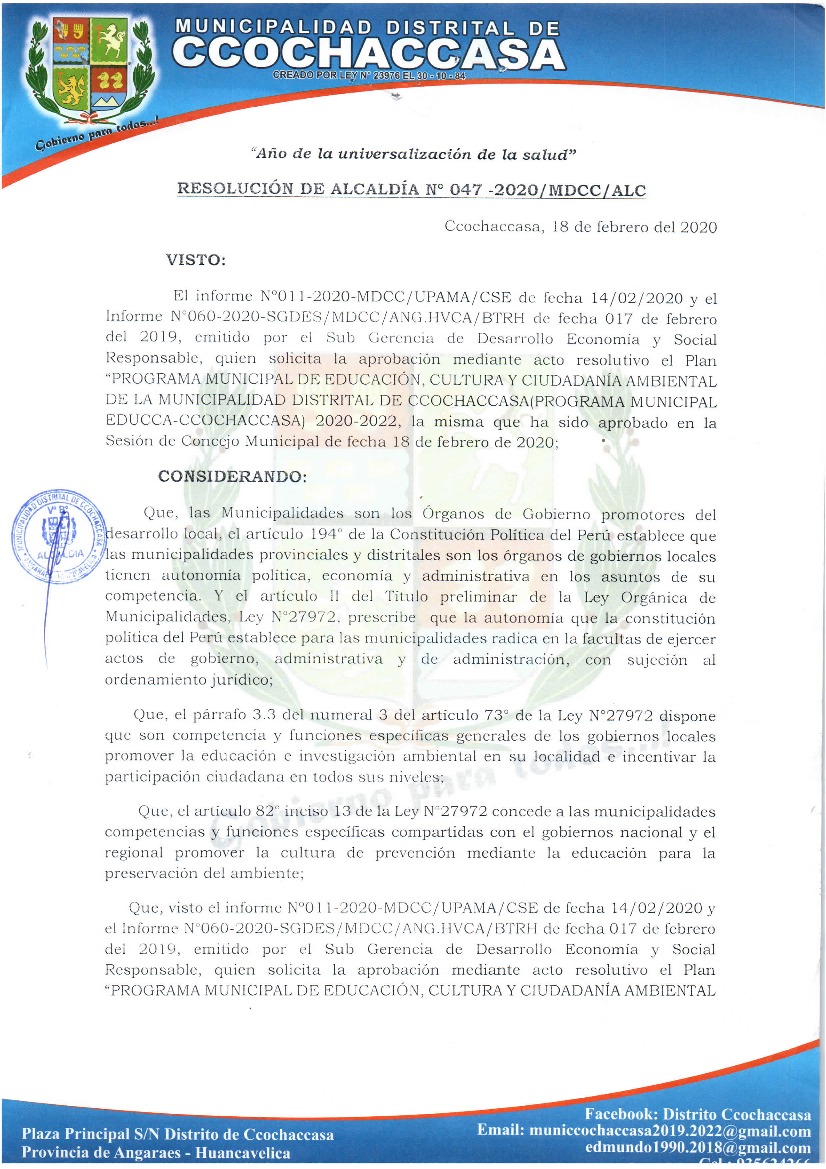 Programa Municipal de Educación, Cultura y Ciudadanía Ambiental de la Municipalidad Distrital de Ccochaccasa 2020-2022