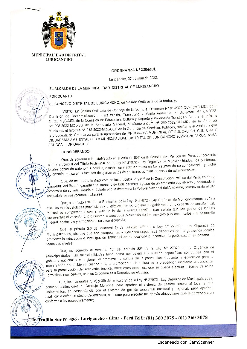 La presente Ordenanza/ Resolución aprueba el Programa Municipal de Educación, Cultura y Ciudadanía Ambiental de la Municipalidad Distrital de Lurigancho (Lima), para el periodo 2022-2025; con la finalidad de promover la cultura y la educación ambiental para la formación de ciudadanas y ciudadanos ambientalmente responsables e incentivar la participación ciudadana en todos sus niveles.