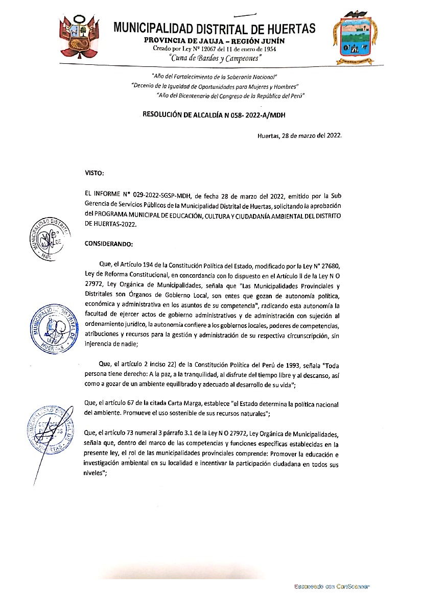 La presente Resolución aprueba el Programa Municipal de Educación, Cultura y Ciudadanía Ambiental de la Municipalidad Distrital de Huertas, para el año 2022; con la finalidad de promover la cultura y la educación ambiental para la formación de ciudadanas y ciudadanos ambientalmente responsables e incentivar la participación ciudadana en todos sus niveles.
