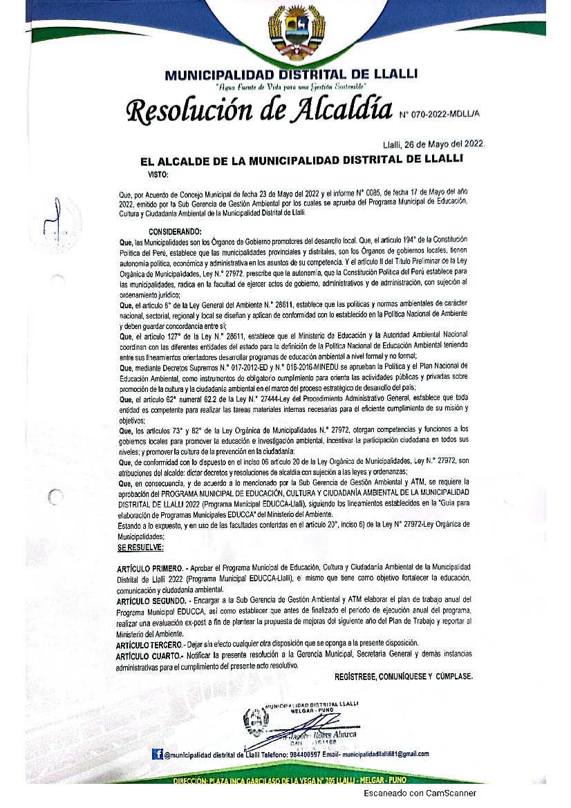 La presente Resolución aprueba el Programa Municipal de Educación, Cultura y Ciudadanía Ambiental de la Municipalidad Distrital de Llalli para el año 2022; con la finalidad de promover la cultura y la educación ambiental para la formación de ciudadanas y ciudadanos ambientalmente responsables e incentivar la participación ciudadana en todos sus niveles.