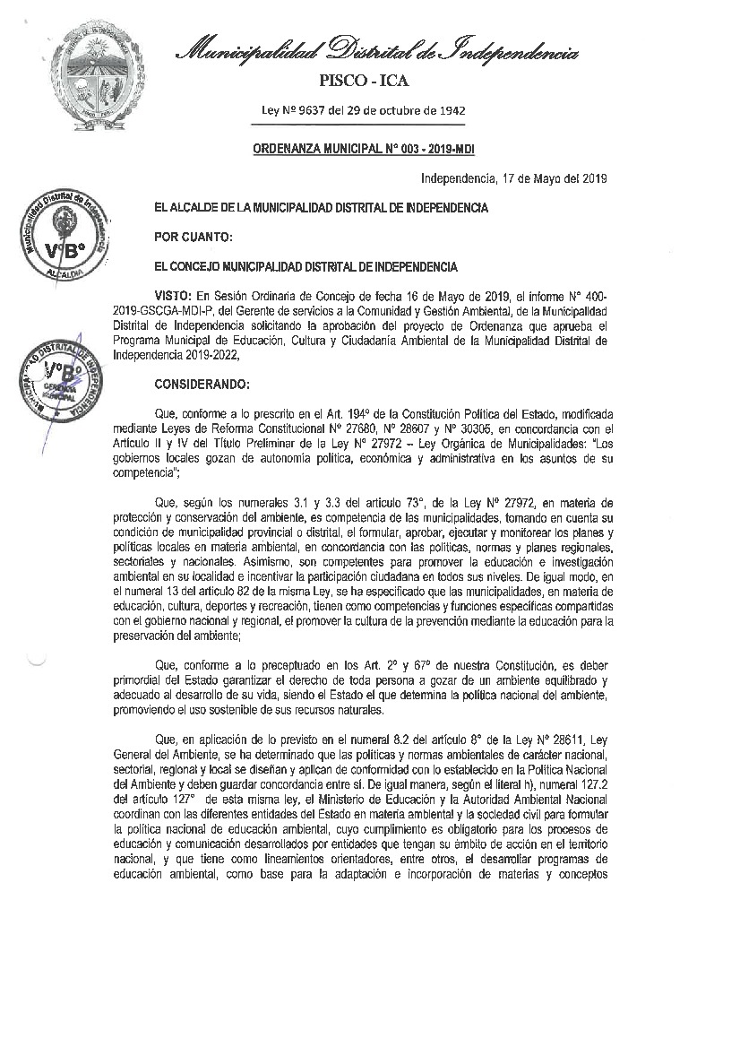 La presente Ordenanza Municipal aprueba el Programa Municipal de Educación, Cultura y Ciudadanía Ambiental de la Municipalidad Distrital de Independencia, distrito de la provicnia de Pisco, para el periodo 2019- 2022; con la finalidad de promover la cultura y la educación ambiental para la formación de ciudadanas y ciudadanos ambientalmente responsables e incentivar la participación ciudadana en todos sus niveles.