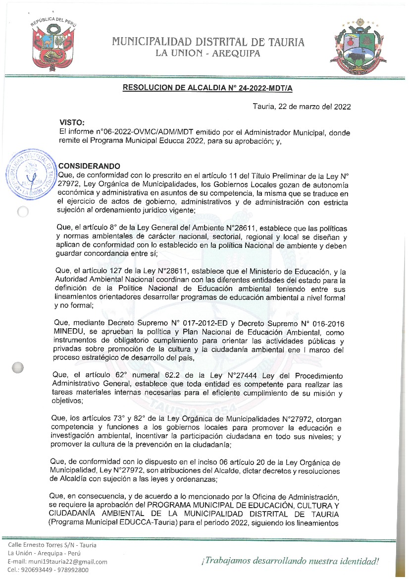 Programa Municipal de Educación, Cultura y Ciudadanía Ambiental de la Municipalidad Distrital de Tauria - 2022