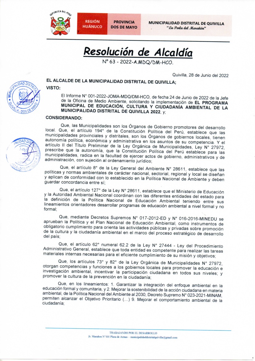 La presente Resolución aprueba el Programa Municipal de Educación, Cultura y Ciudadanía Ambiental de la Municipalidad Distrital de Quivilla, para el periodo 2022; con la finalidad de promover la cultura y la educación ambiental para la formación de ciudadanas y ciudadanos ambientalmente responsables e incentivar la participación ciudadana en todos sus niveles.