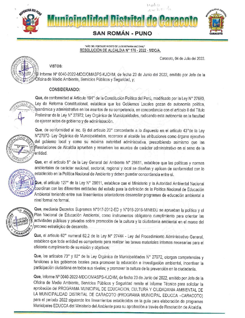 La presente Resolución aprueba el Programa Municipal de Educación, Cultura y Ciudadanía Ambiental de la Municipalidad Distrital de Caracoto, para el año 2022; con la finalidad de promover la cultura y la educación ambiental para la formación de ciudadanas y ciudadanos ambientalmente responsables e incentivar la participación ciudadana en todos sus niveles.