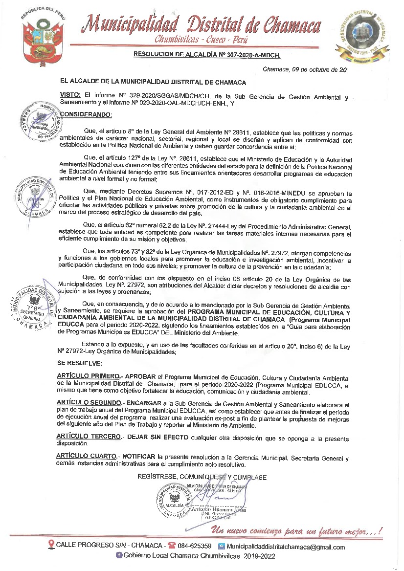 La presente Resolución aprueba el Programa Municipal de Educación, Cultura y Ciudadanía Ambiental de la Municipalidad Distrital de Chamaca, Chumbivilcas (Cusco), para el periodo 2020-2022; con la finalidad de promover la cultura y la educación ambiental para la formación de ciudadanas y ciudadanos ambientalmente responsables e incentivar la participación ciudadana en todos sus niveles.