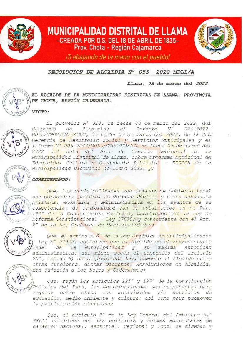 La presente Resolución aprueba el Programa Municipal de Educación, Cultura y Ciudadanía Ambiental de la Municipalidad Distrital de Llama, Chota (Cajamarca), para el periodo 2022; con la finalidad de promover la cultura y la educación ambiental para la formación de ciudadanas y ciudadanos ambientalmente responsables e incentivar la participación ciudadana en todos sus niveles.