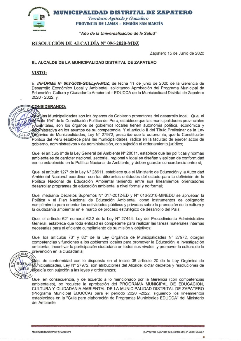 La presente Resolución aprueba el Programa Municipal de Educación, Cultura y Ciudadanía Ambiental de la Municipalidad Distrital de Zapatero, para el periodo 2020 - 2022; con la finalidad de promover la cultura y la educación ambiental para la formación de ciudadanas y ciudadanos ambientalmente responsables e incentivar la participación ciudadana en todos sus niveles.