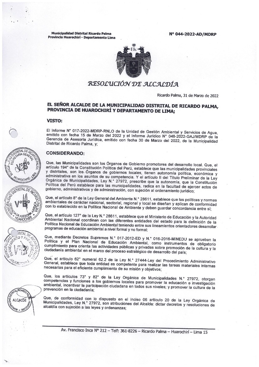 Programa Municipal de Educación, Cultura y Ciudadanía Ambiental de la Municipalidad Distrital de Ricardo Palma 2022