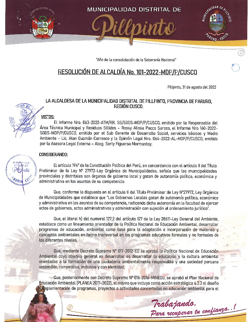 La presente Resolución aprueba el Programa Municipal de Educación, Cultura y Ciudadanía Ambiental de la Municipalidad Distrital de Pillpinto, Paruro (Cusco), para el periodo 2022; con la finalidad de promover la cultura y la educación ambiental para la formación de ciudadanas y ciudadanos ambientalmente responsables e incentivar la participación ciudadana en todos sus niveles.