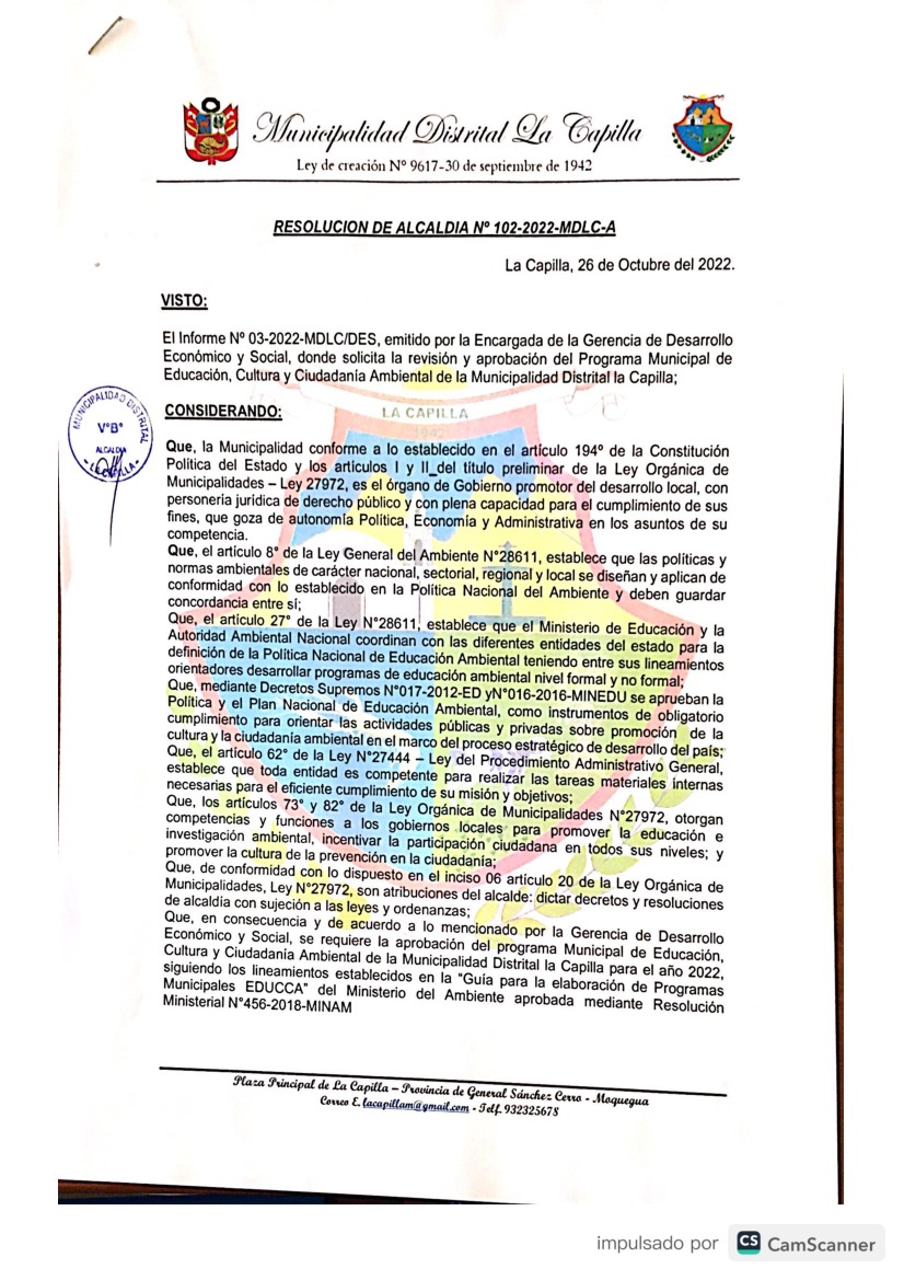 La presente Resolución aprueba el Programa Municipal de Educación, Cultura y Ciudadanía Ambiental de la Municipalidad Distrital de La Capilla- General Sánchez Cerro; con la finalidad de promover la cultura y la educación ambiental para la formación de ciudadanas y ciudadanos ambientalmente responsables e incentivar la participación ciudadana en todos sus niveles.