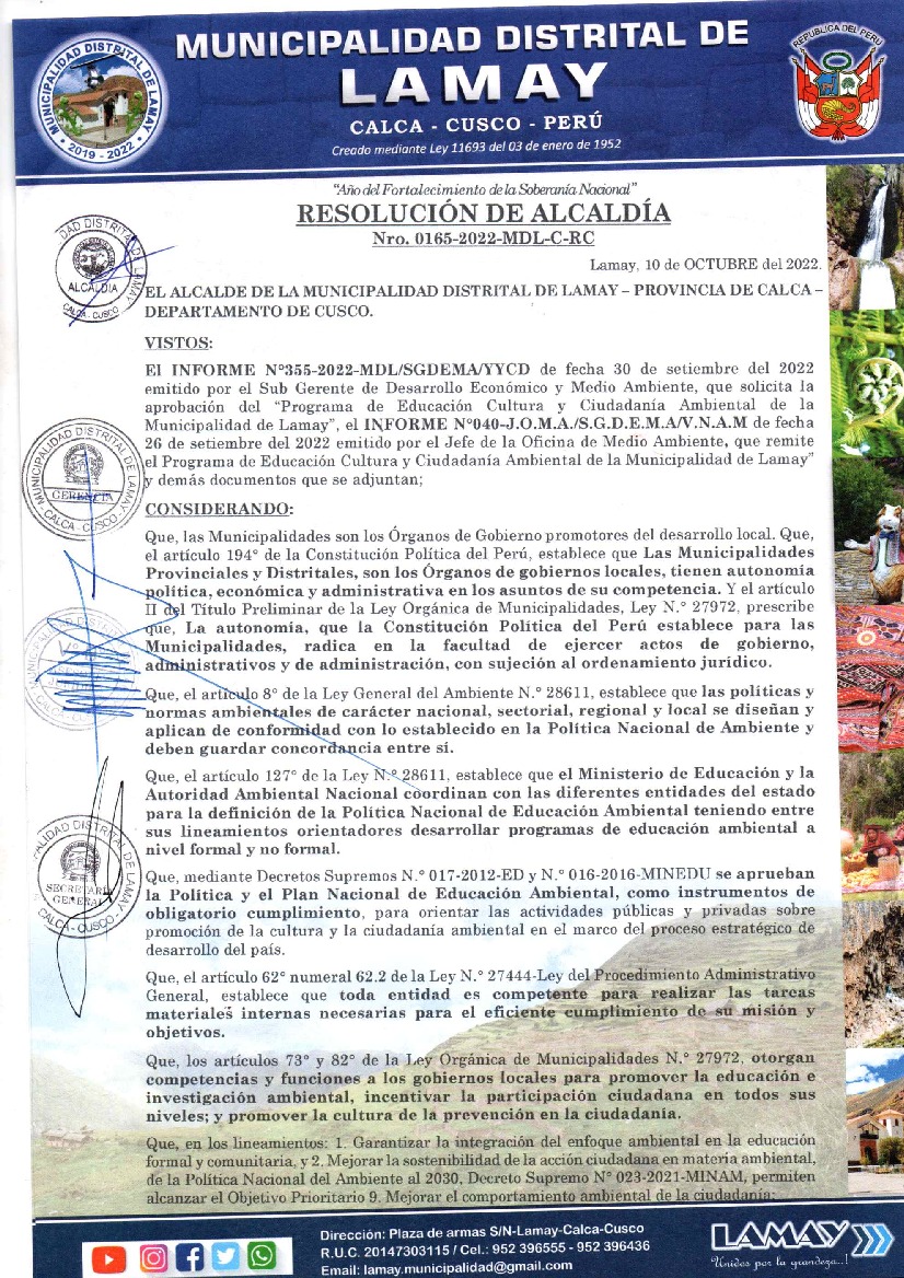 La presente Resolución aprueba el Programa Municipal de Educación, Cultura y Ciudadanía Ambiental de la Municipalidad Distrital de Lamay, Calca(Cusco), para el periodo 2022; con la finalidad de promover la cultura y la educación ambiental para la formación de ciudadanas y ciudadanos ambientalmente responsables e incentivar la participación ciudadana en todos sus niveles.