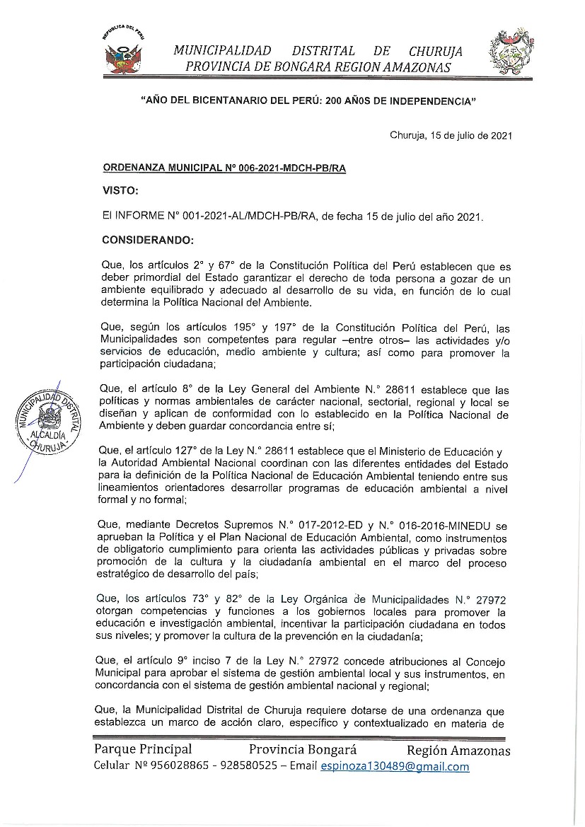 La presente Ordenanza aprueba el Programa Municipal de Educación, Cultura y Ciudadanía Ambiental de la Municipalidad Distrital de Churuja - Bongará (Amazonas), para el periodo 2022 - 2023; con la finalidad de promover la cultura y la educación ambiental para la formación de ciudadanas y ciudadanos ambientalmente responsables e incentivar la participación ciudadana en todos sus niveles.