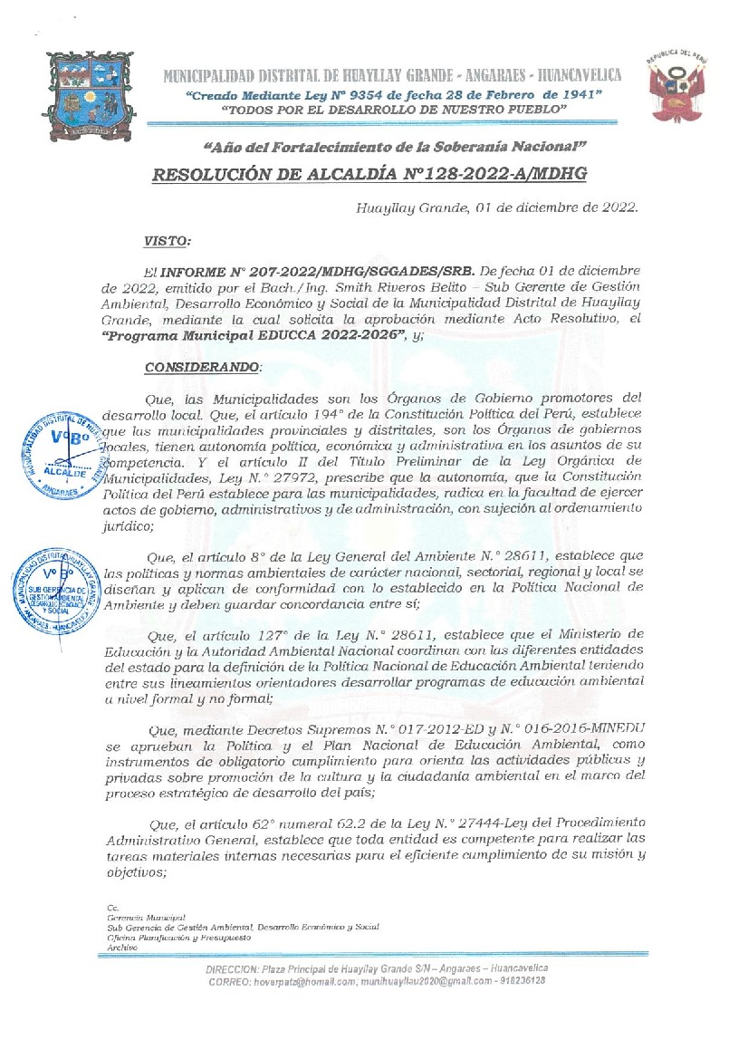 La presente Resolución aprueba el Programa Municipal de Educación, Cultura y Ciudadanía Ambiental de la Municipalidad Distrital de Huayllay Grande, para el año 2022; con la finalidad de promover la cultura y la educación ambiental para la formación de ciudadanas y ciudadanos ambientalmente responsables e incentivar la participación ciudadana en todos sus niveles.