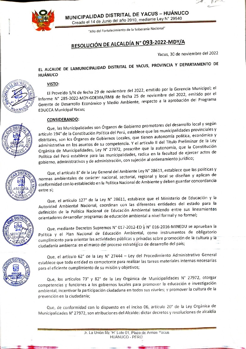 La presente Resolución aprueba el Programa Municipal de Educación, Cultura y Ciudadanía Ambiental de la Municipalidad Distrital de Yacus, para el periodo 2022; con la finalidad de promover la cultura y la educación ambiental para la formación de ciudadanas y ciudadanos ambientalmente responsables e incentivar la participación ciudadana en todos sus niveles.