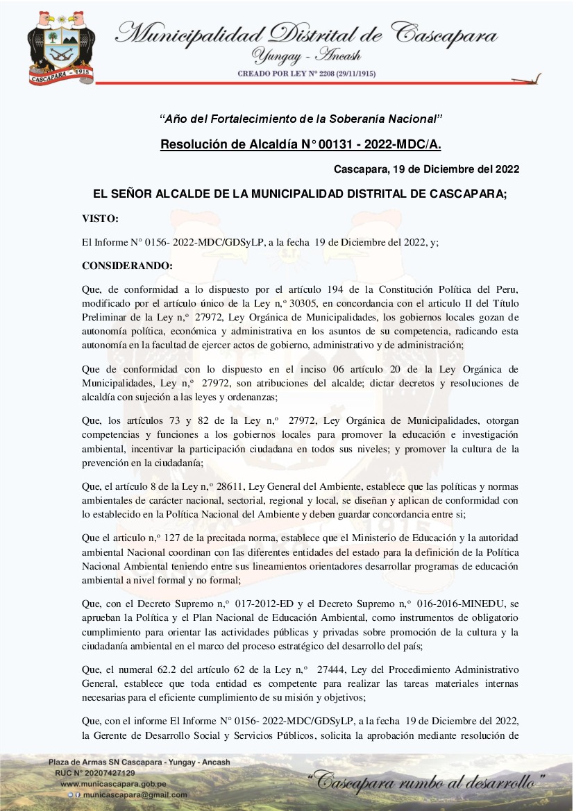 Programa Municipal de Educación, Cultura y Ciudadanía Ambiental de la Municipalidad Distrital de Cascapara - 2022