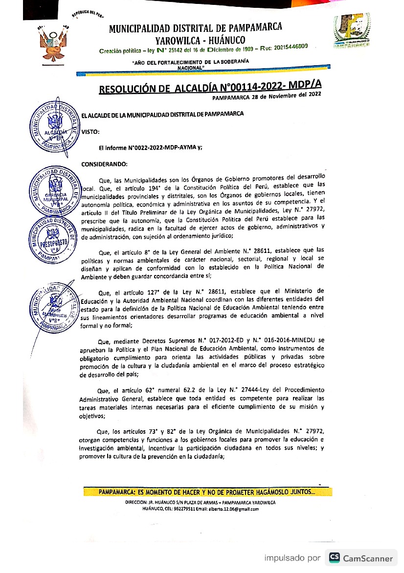 La presente Resolución aprueba el Programa Municipal de Educación, Cultura y Ciudadanía Ambiental de la Municipalidad Distrital de Pampamarca, para el periodo 2022; con la finalidad de promover la cultura y la educación ambiental para la formación de ciudadanas y ciudadanos ambientalmente responsables e incentivar la participación ciudadana en todos sus niveles.