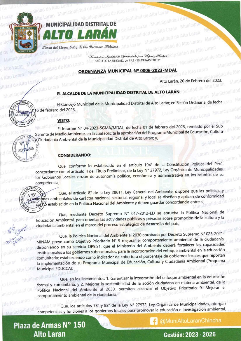 La presente Ordenanza aprueba el Programa Municipal de Educación, Cultura y Ciudadanía Ambiental de la Municipalidad Distrital de Alto Larán, Chincha (Ica); con la finalidad de promover la cultura y la educación ambiental para la formación de ciudadanas y ciudadanos ambientalmente responsables e incentivar la participación ciudadana en todos sus niveles.